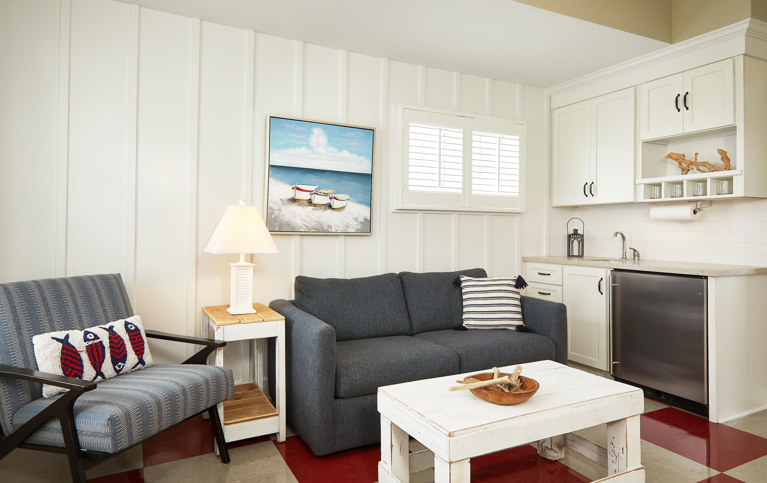 Family room area with a queen sofa sleeper, armchair, TV, full bathroom, private bedroom with queen bed and TV, washer/dryer, and a mini kitchenette with small refrigerator and sink, private rear patio with grill and seating area.