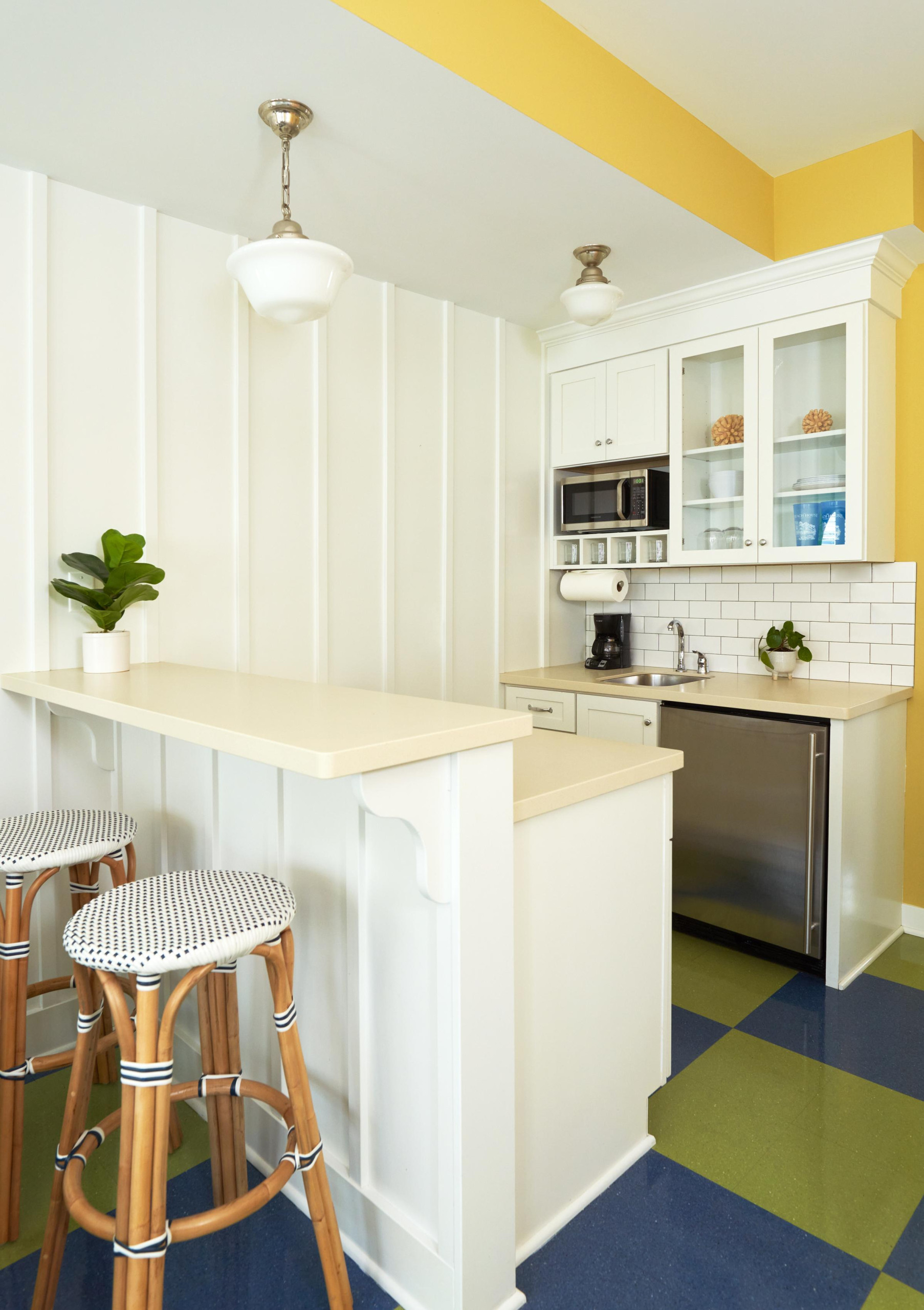 The first floor includes two bedrooms, a living area, bathroom and mini bar. This is the perfect area for guests who would rather not use the stairs. Additionally, the first floor offers the added benefit of total privacy with the ability to lock off from the rest of the unit creating a private studio space including a bunk room (sleeping up to three in twin beds), a sectional sofa with sleeper sofa (air coil mattresses for added comfort) and a private bedroom with queen size bed .
